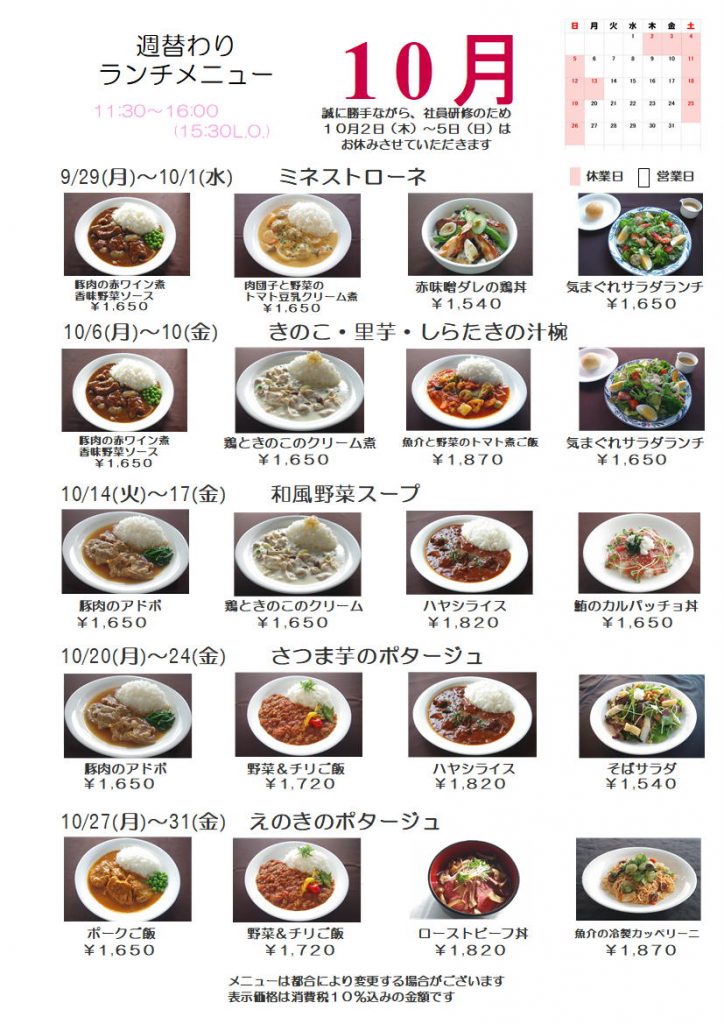10月週替わりランチメニューのお知らせ